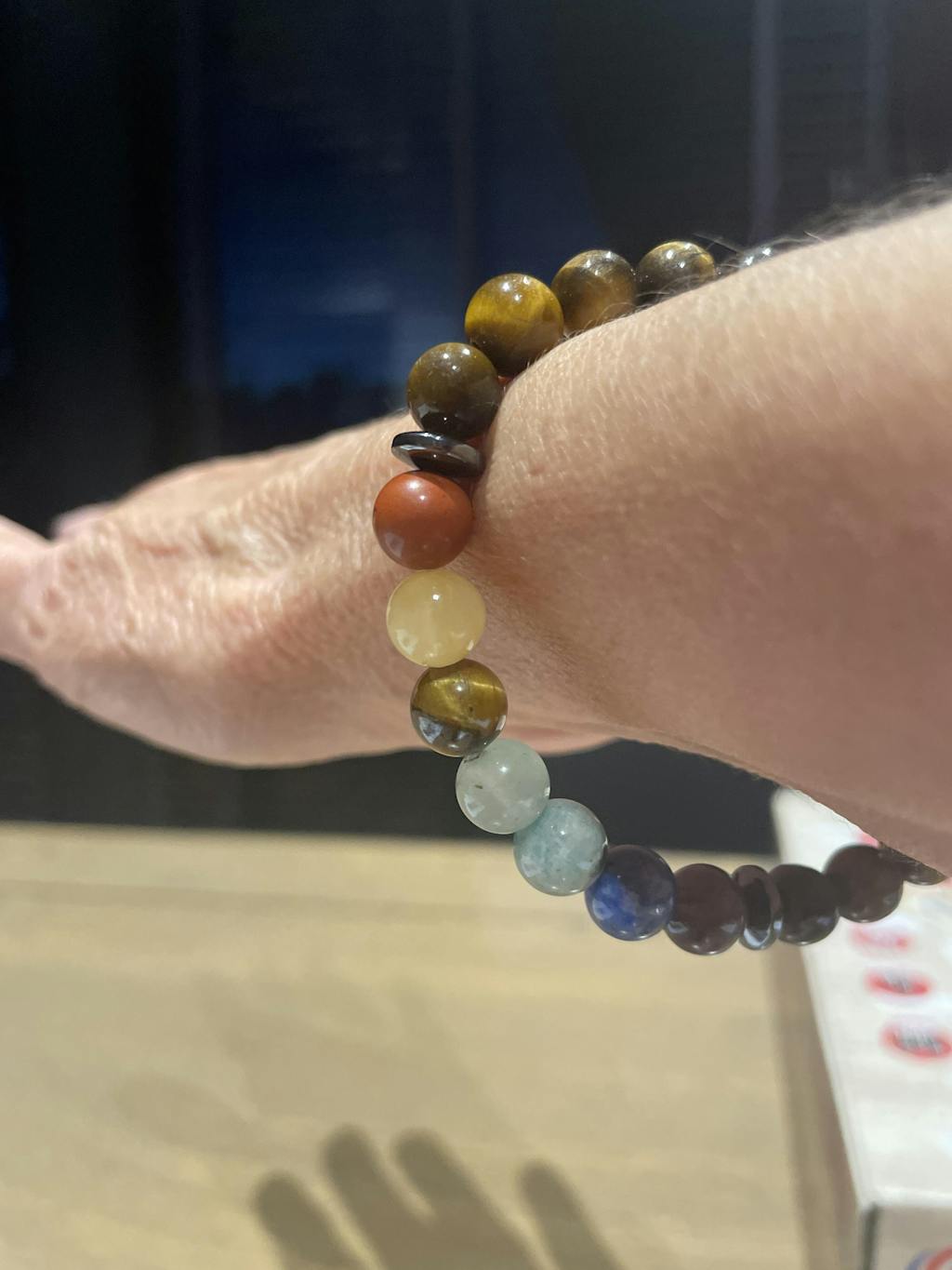 Ces pierres multicolores sont harmonieusement assemblées avec des perles d’œil de tigre, reconnaissables à leurs reflets chatoyants dans les tons dorés et bruns.