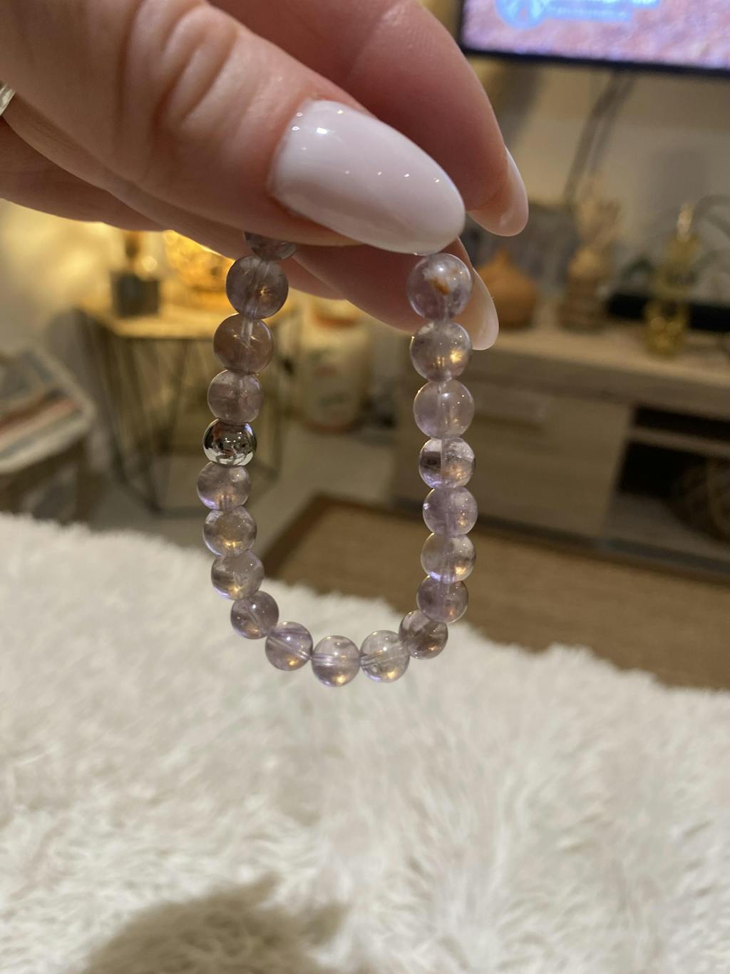 Le bracelet est composé de perles rondes lisses ou facettées, aux reflets violets captivants. Les perles mesurent généralement entre 6 mm et 10 mm, selon les préférences de discrétion ou d’intensité.